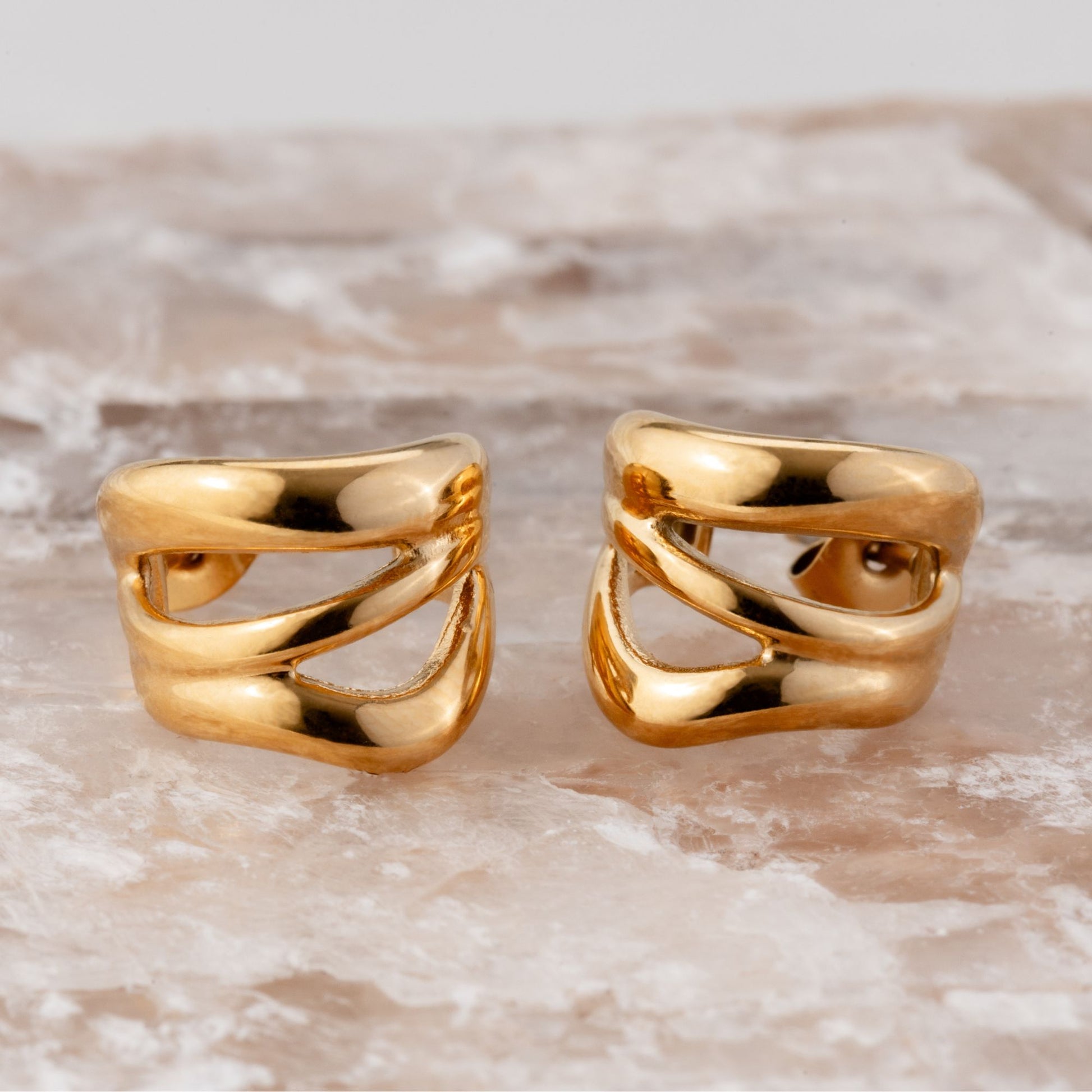 Acero inoxidable 316L con baño de oro 18k; aretes tipo doble aro con estilo moderno y sofisticado.