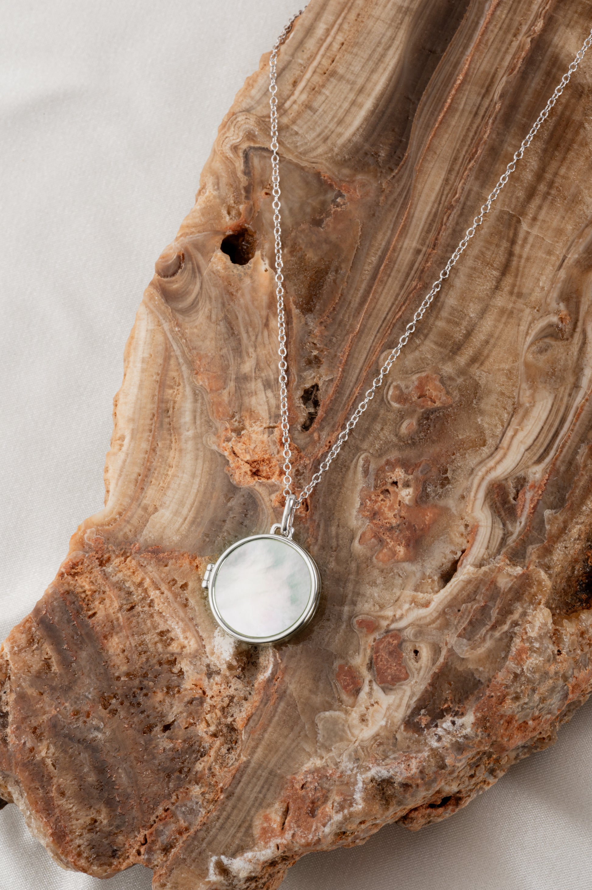 Collar con relicario circular cubierto de madre perla natural, se abre para guardar una foto pequeña, un mensaje o un recuerdo especial.